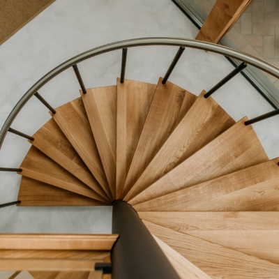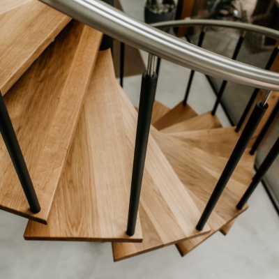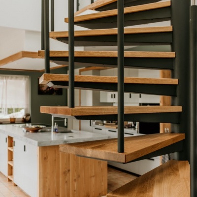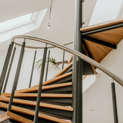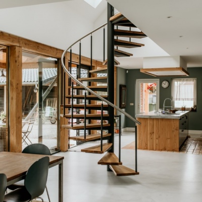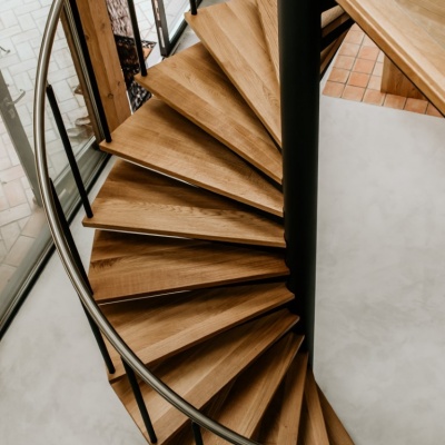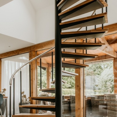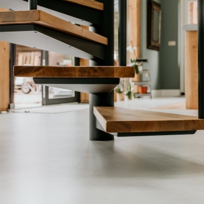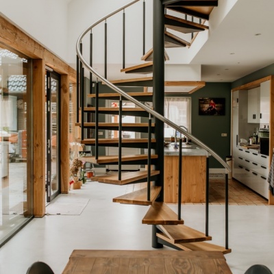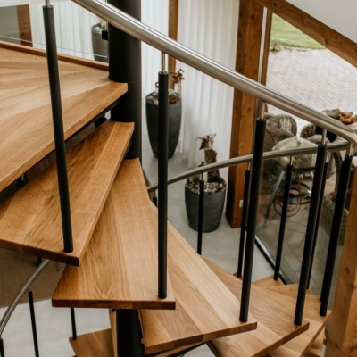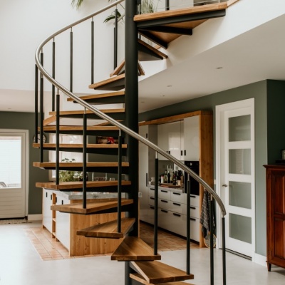 Een echte eye-catcher in de ruimte, deze spiltrap. Een mooie stevige stalen constructie gecombineerd met eikenhouten treden en een glazen balustrade met RVS leuning zorgen voor een mooie open constructie.