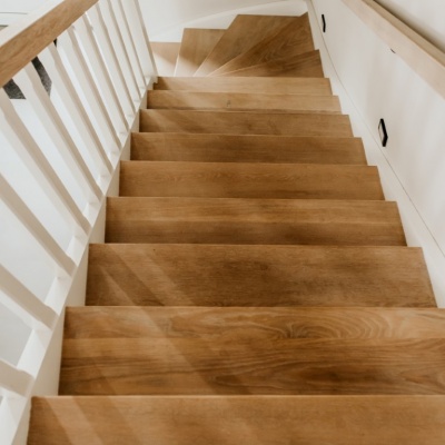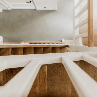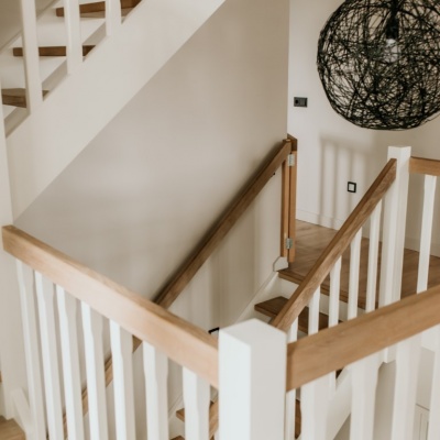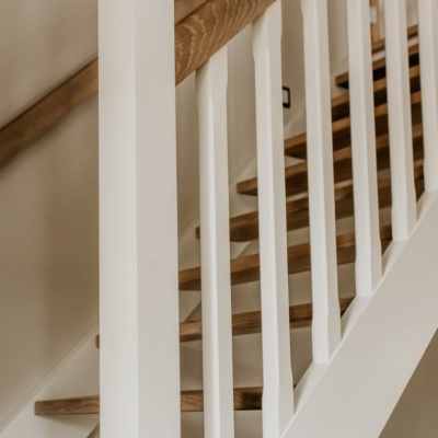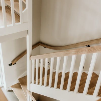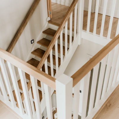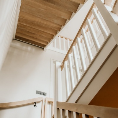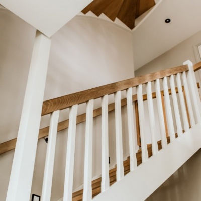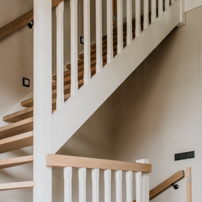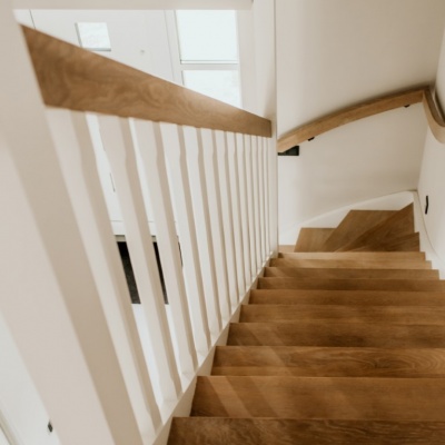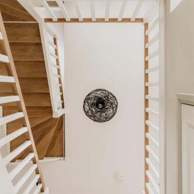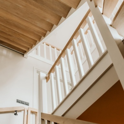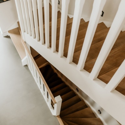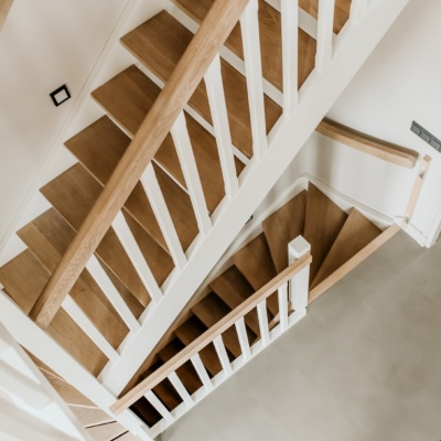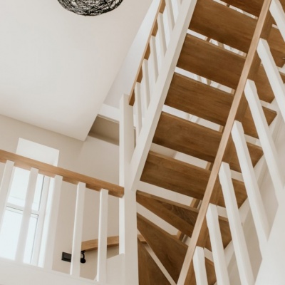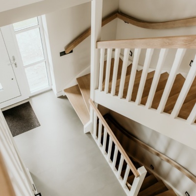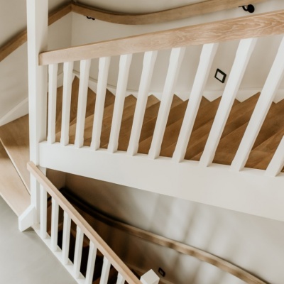 Geweldige imposante trap met een landelijke, maar toch stoere en frisse, uitstraling. Deze open trap over 3 verdiepingen is van eikenhout in een combi van houtkleur en wit. Een mooie combinatie met de strakke vloer en muren.
